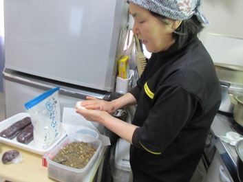 箸で混ぜてヘラで捏ねるという、手を汚さない手馴れた工程です。