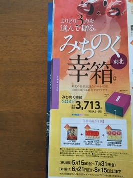 『みちのく幸箱(こばこ)』といって、東北の名産品24点の中から、よりどり3点を自由に選んで贈る、組み合わせギフトです。(P22,23参照)税込4,010円です。