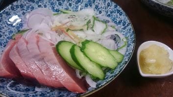 スリスリして、カツオのお刺身に添えてっと