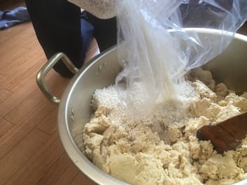 ③ 別袋で麹と塩をまぜて潰した大豆と混ぜます。