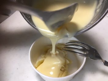 バナナをつぶしたものを先に入れて生地を流してから混ぜました。