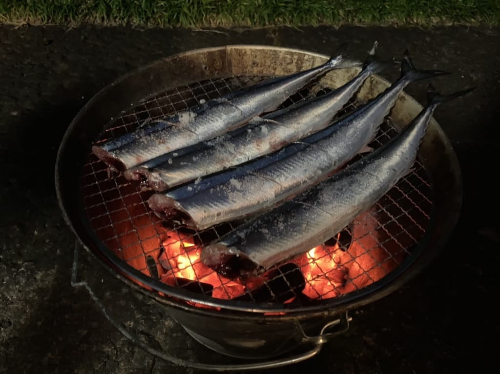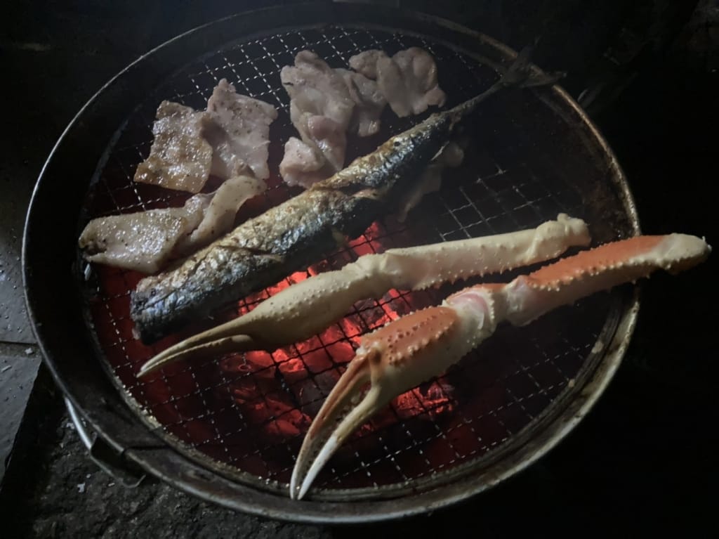 七輪で炭火焼(ほんとは、ジンギスカンの鍋です)