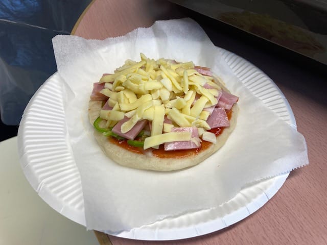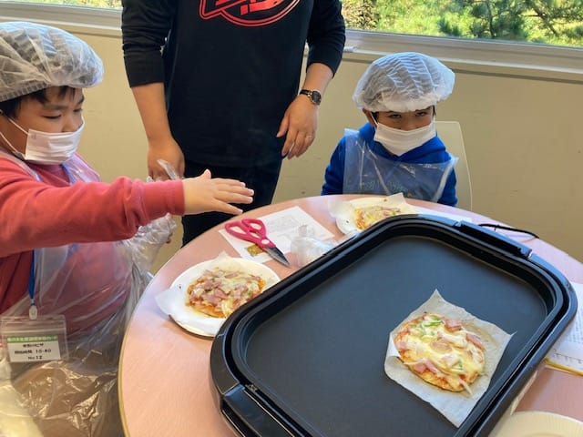 みんなが集まり、クッキングシートの上で平らに成型して片面焼きひっくり返してトッピング