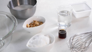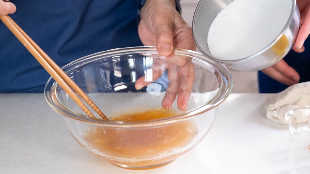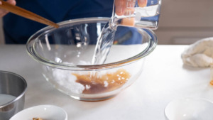 耐熱ボウルに水・砂糖・醤油を入れ、混ぜ合わせ