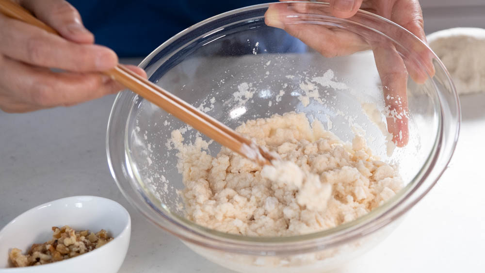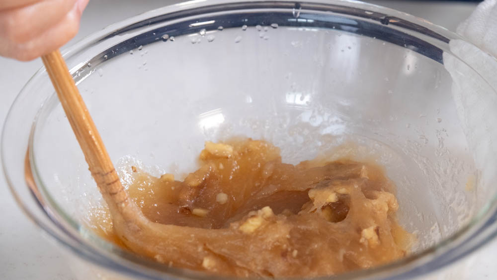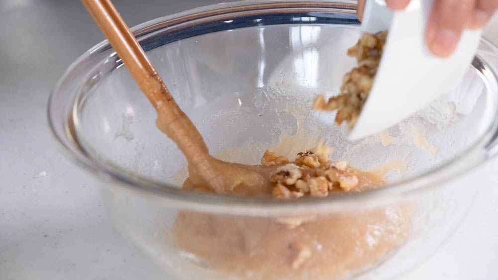くるみを入れて、電子レンジで600W 2分加熱したと、かき混ぜます。