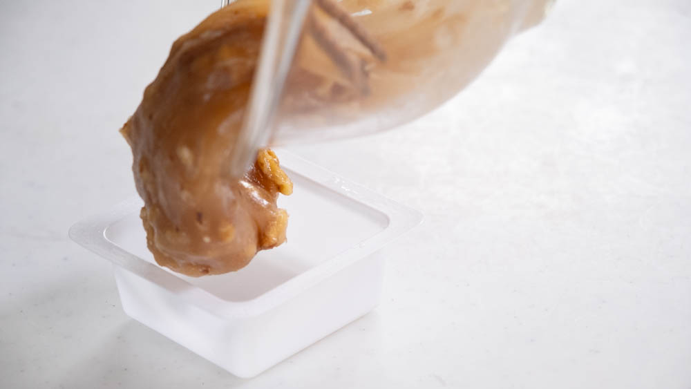 タッパーなどの容器に入れて、冷まします。今回は使い終わったお豆腐の容器を流用しました。