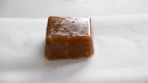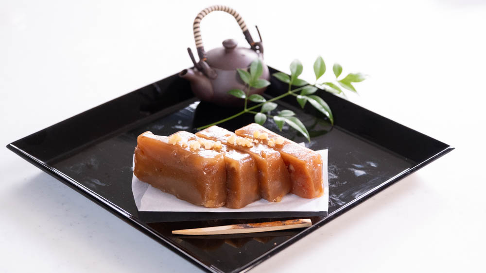 お好きな分量で切り分け、盛り付ければ出来上がりです。切る時に包丁に油を塗ると、きれいに切ることができます。粉オブラートかグラニュー糖をまぶして仕上げると綺麗にできます。今回は胡桃だけトッピングしてみました。