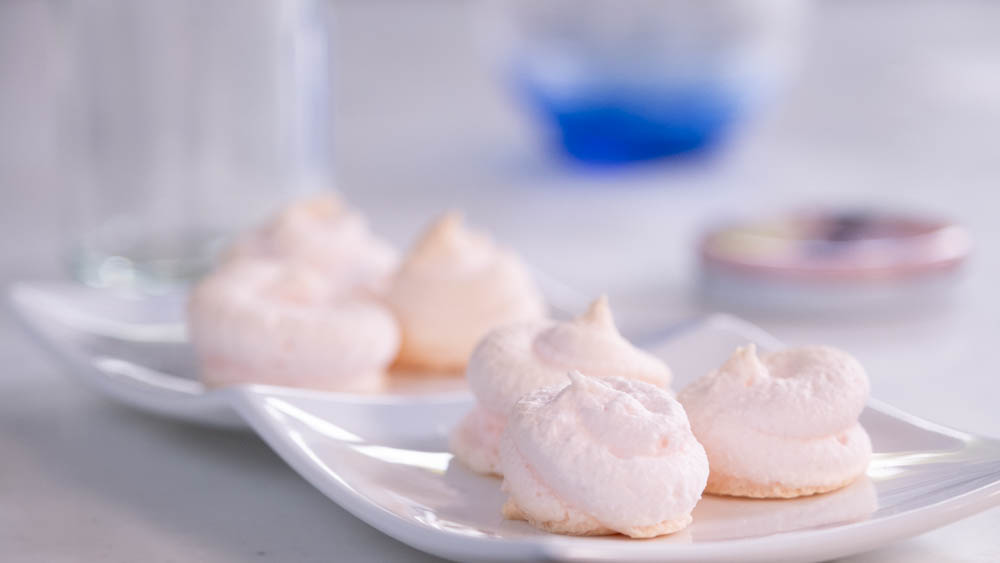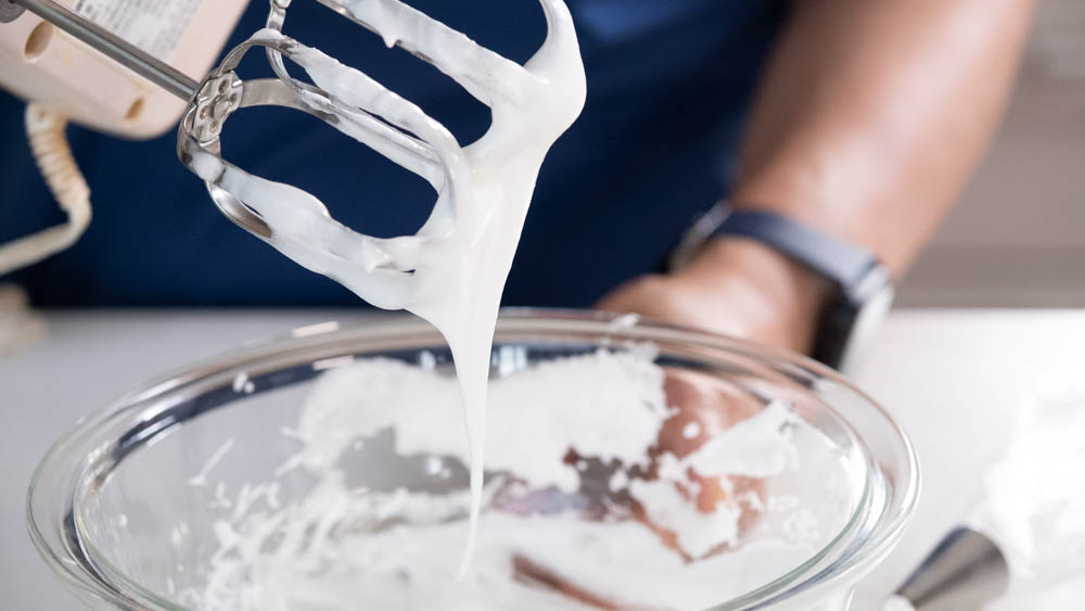 1、卵白をほぐしてグラニュー糖を少しずつ加えながらメレンゲを作る。